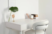 Zdjęcie "Wygodne miejsce pracy z białym biurkiem w pobliżu ściany w pomieszczeniach" może być wykorzystywane do celów osobistych i komercyjnych zgodnie z warunkami zakupionej licencji Royalty-free. Obraz jest dostępny do pobrania w jakości wysokiej rozdzielczości do 5760x3840.