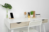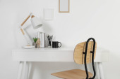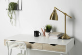 Wygodne miejsce pracy z białym biurkiem w pobliżu ściany w pomieszczeniach