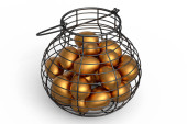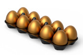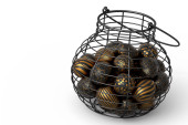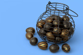 Luksusowe złote jaja w metalowym koszu lub tekturze papierowej izolowane na białym tle. 3d renderowania koncepcji Wielkanoc lub jaj kurzych na omlet lub jajecznicę smażone jajko na śniadanie rano
