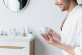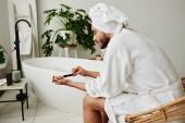 Zdjęcie "Młody przystojny mężczyzna w szlafroku wybiera modny kolor lakieru do swojego manicure siedząc w łazience" może być wykorzystywane do celów osobistych i komercyjnych zgodnie z warunkami zakupionej licencji Royalty-free. Obraz jest dostępny do pobrania w jakości wysokiej rozdzielczości do 5760x3840.