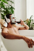 Młody przystojny mężczyzna w szlafroku wybiera modny kolor lakieru do swojego manicure siedząc w łazience