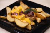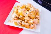 Zdjęcie "Papas bravas, to typowe przygotowanie barów w Hiszpanii składające się z ziemniaków pokrojonych w duże kostki, smażonych na oliwie z oliwek i przyprawionych brawą salsa, która jest pikantnym sosem." może być wykorzystywane do celów osobistych i komercyjnych zgodnie z warunkami zakupionej licencji Royalty-free. Obraz jest dostępny do pobrania w jakości wysokiej rozdzielczości do 5760x3840.