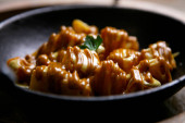 Zdjęcie "Papas bravas, to typowe przygotowanie barów w Hiszpanii składające się z ziemniaków pokrojonych w duże kostki, smażonych na oliwie z oliwek i przyprawionych brawą salsa, która jest pikantnym sosem." może być wykorzystywane do celów osobistych i komercyjnych zgodnie z warunkami zakupionej licencji Royalty-free. Obraz jest dostępny do pobrania w jakości wysokiej rozdzielczości do 5760x3840.
