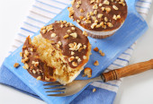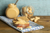 Smaczne kanapki ze świeżego masła orzechowego na drewniane tła