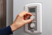 Zbliżenie dłoni kobiecej ustawienie temperatury pokojowej na tryb