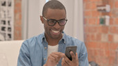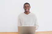 African Man uśmiecha się do kamery podczas pracy na laptopie