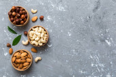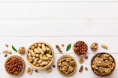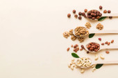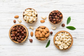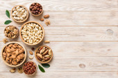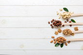 mixed nuts in white wooden spoon. Mix of various nuts on colored background. pistachios, cashews, walnuts, hazelnuts, peanuts and brazil nuts.