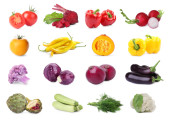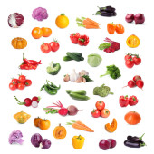 Asortyment świeżych owoców i warzyw na białym tle, projekt kolażu