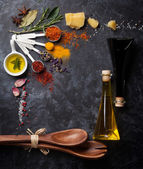 Miniaturowe patelnie z przyprawami, solą, czarnym pieprzem i pachnącym pieprzem, gałązka rozmarynu na czarnym stole. Przyprawy do gotowania