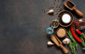 Zdjęcie "Miniaturowe patelnie z przyprawami, solą, czarnym pieprzem i pachnącym pieprzem, gałązka rozmarynu na czarnym stole. Przyprawy do gotowania" może być wykorzystywane do celów osobistych i komercyjnych zgodnie z warunkami zakupionej licencji Royalty-free. Obraz jest dostępny do pobrania w jakości wysokiej rozdzielczości do 5760x3840.