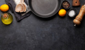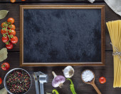 Pusta brązowa drewniana deska i przyprawy na czarnym stole, widok z góry