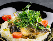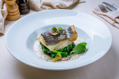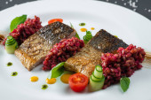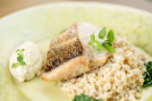 Pieczone filet z białej ryby podawany z ryżu parzona