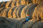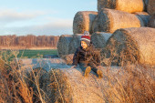 A cute little boy in autumn clothes and a knitted hat poses against a background of golden hay bales. Vertical photo.