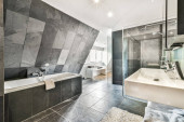 Zdjęcie "nowoczesna łazienka z czarno-białymi płytkami na ścianach, umywalka, lustro i kabina prysznicowa w nim" może być wykorzystywane do celów osobistych i komercyjnych zgodnie z warunkami zakupionej licencji Royalty-free. Obraz jest dostępny do pobrania w jakości wysokiej rozdzielczości do 5760x3840.
