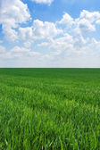 Szerokie pole z młodą zieloną trawą i malowniczym błękitnym niebem z białymi chmurami. Wiosenny krajobraz. Zielona trawa w polu