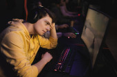 Skoncentrowany Indianin w słuchawkach patrząc na monitor komputera w klubie gier