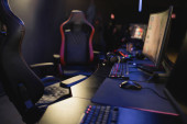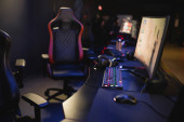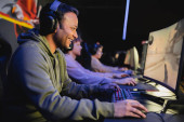 Widok z boku hinduskiego gracza w słuchawki grającego w grę wideo z zamazaną drużyną w klubie