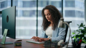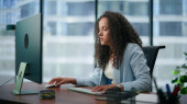 Zdjęcie "Latynoska menedżer prowadzenia wywiadu online za pomocą laptopa w biurze z bliska. Atrakcyjna brunetka uśmiechnięta rozmową wideo z kolegami. Bizneswoman korzystająca z technologii bezprzewodowej w pracy." może być wykorzystywane do celów osobistych i komercyjnych zgodnie z warunkami zakupionej licencji Royalty-free. Obraz jest dostępny do pobrania w jakości wysokiej rozdzielczości do 5760x3840.