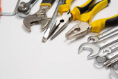 Zdjęcie "Zestaw narzędzi do naprawy w przypadku na białym tle. Różne narzędzia robocze lub budowlane. Klucze, szczypce, śrubokręt. Widok z góry" może być wykorzystywane do celów osobistych i komercyjnych zgodnie z warunkami zakupionej licencji Royalty-free. Obraz jest dostępny do pobrania w jakości wysokiej rozdzielczości do 5760x3840.