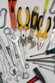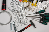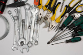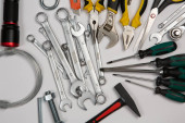 Zdjęcie "Zestaw narzędzi do naprawy w przypadku na białym tle. Różne narzędzia robocze lub budowlane. Klucze, szczypce, śrubokręt. Widok z góry" może być wykorzystywane do celów osobistych i komercyjnych zgodnie z warunkami zakupionej licencji Royalty-free. Obraz jest dostępny do pobrania w jakości wysokiej rozdzielczości do 5760x3840.
