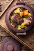 Noga jagnięca pieczona z ziemniakami, papryką, marchewką i czerwoną cebulą w naczyniu ceramicznym z pokrywką.