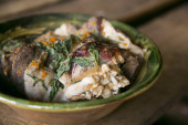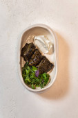 Dolma z filetem jagnięcym i ryż z ziołami zawiniętymi w liście winogron. W pobliżu leży kwaśna śmietana i mieszana sałatka różnych rodzajów zieleni. Jedzenie leży w owalnej ceramicznej płytce..