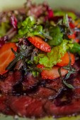 Zdjęcie "Dolma z filetem jagnięcym i ryż z ziołami zawiniętymi w liście winogron. W pobliżu leży kwaśna śmietana i mieszana sałatka różnych rodzajów zieleni. Jedzenie leży w owalnej ceramicznej płytce.." może być wykorzystywane do celów osobistych i komercyjnych zgodnie z warunkami zakupionej licencji Royalty-free. Obraz jest dostępny do pobrania w jakości wysokiej rozdzielczości do 5760x3840.