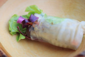 Dolma z filetem jagnięcym i ryż z ziołami zawiniętymi w liście winogron. W pobliżu leży kwaśna śmietana i mieszana sałatka różnych rodzajów zieleni. Jedzenie leży w owalnej ceramicznej płytce..