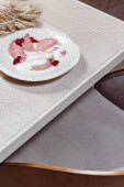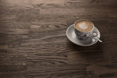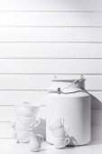Kawa z mlekiem w jasnej ceramicznej filiżance na talerzu z łyżeczką. W pobliżu znajduje się lekki ceramiczny dzbanek do mleka. Naczynia są na drewnianym stole..
