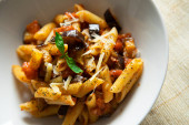 Makaron z zapiekanką z żeberkami wieprzowymi. Tradycyjny hiszpański tapa przepis gotowane w piekarniku.