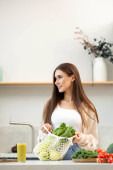 Zdrowy styl życia młoda kobieta jedząca sałatę. Młoda brunetka jedząca zdrowe jedzenie w kuchni.