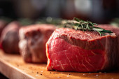 stek wołowy z rozmarynem i przyprawami na drewnianej desce