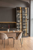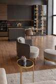 Zdjęcie "salon, marmurowy kominek ścienny i stylowa biblioteczka w eleganckim, drogim wnętrzu luksusowego domu wiejskiego o nowoczesnym designie z drewna i lekkich, szarych mebli z elementami złota" może być wykorzystywane do celów osobistych i komercyjnych zgodnie z warunkami zakupionej licencji Royalty-free. Obraz jest dostępny do pobrania w jakości wysokiej rozdzielczości do 5760x3840.