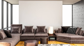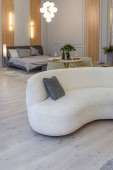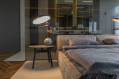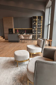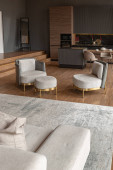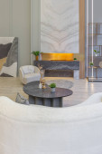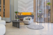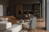 Zdjęcie "salon, marmurowy kominek ścienny i stylowa biblioteczka w eleganckim, drogim wnętrzu luksusowego domu wiejskiego o nowoczesnym designie z drewna i lekkich, szarych mebli z elementami złota" może być wykorzystywane do celów osobistych i komercyjnych zgodnie z warunkami zakupionej licencji Royalty-free. Obraz jest dostępny do pobrania w jakości wysokiej rozdzielczości do 5760x3840.