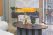 salon, marmurowy kominek ścienny i stylowa biblioteczka w eleganckim, drogim wnętrzu luksusowego domu wiejskiego o nowoczesnym designie z drewna i lekkich, szarych mebli z elementami złota