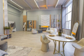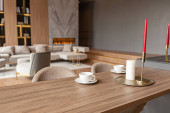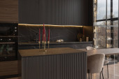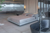sypialnia i wolnostojąca wanna za szklaną ścianą działową w eleganckim, drogim wnętrzu luksusowego domu o ciemnym, nowoczesnym wzornictwie z wykończeniem drewnianym i oświetleniem LED