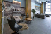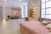 Zdjęcie "sypialnia i wolnostojąca wanna za szklaną ścianą działową w eleganckim, drogim wnętrzu luksusowego domu o ciemnym, nowoczesnym wzornictwie z wykończeniem drewnianym i oświetleniem LED" może być wykorzystywane do celów osobistych i komercyjnych zgodnie z warunkami zakupionej licencji Royalty-free. Obraz jest dostępny do pobrania w jakości wysokiej rozdzielczości do 5760x3840.