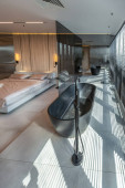 wyjątkowa kąpiel i sypialnia elegancki nowoczesny design ciemne drogie wnętrze luksusowego wiejskiego domu z ogromnymi oknami panoramicznymi i wspaniały widok na boski las