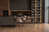 Zdjęcie "chic modern design of a dark expensive interior of a luxurious cozy apartment" może być wykorzystywane do celów osobistych i komercyjnych zgodnie z warunkami zakupionej licencji Royalty-free. Obraz jest dostępny do pobrania w jakości wysokiej rozdzielczości do 5760x3840.