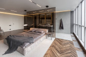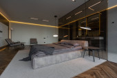 Zdjęcie "sypialnia i wolnostojąca wanna za szklaną ścianą działową w eleganckim, drogim wnętrzu luksusowego domu o ciemnym, nowoczesnym wzornictwie z wykończeniem drewnianym i oświetleniem LED" może być wykorzystywane do celów osobistych i komercyjnych zgodnie z warunkami zakupionej licencji Royalty-free. Obraz jest dostępny do pobrania w jakości wysokiej rozdzielczości do 5760x3840.