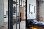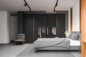Zdjęcie "sypialnia i wolnostojąca wanna za szklaną ścianą działową w eleganckim, drogim wnętrzu luksusowego domu o ciemnym, nowoczesnym wzornictwie z wykończeniem drewnianym i oświetleniem LED" może być wykorzystywane do celów osobistych i komercyjnych zgodnie z warunkami zakupionej licencji Royalty-free. Obraz jest dostępny do pobrania w jakości wysokiej rozdzielczości do 5760x3840.