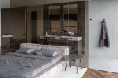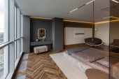 sypialnia i wolnostojąca wanna za szklaną ścianą działową w eleganckim, drogim wnętrzu luksusowego domu o ciemnym, nowoczesnym wzornictwie z wykończeniem drewnianym i oświetleniem LED