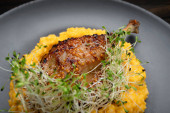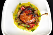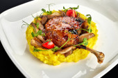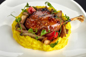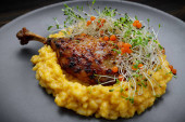 Aromatyczne danie nogi kaczki z chrupiącą skórą i żywe produkty