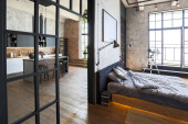 Zdjęcie "luksusowy apartament typu studio z bezpłatnym układem w stylu poddasza w ciemnych kolorach. Stylowa nowoczesna kuchnia z wyspą, przytulna sypialnia z kominkiem i siłownią" może być wykorzystywane do celów osobistych i komercyjnych zgodnie z warunkami zakupionej licencji Royalty-free. Obraz jest dostępny do pobrania w jakości wysokiej rozdzielczości do 5760x3840.