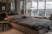 luksusowy apartament typu studio z bezpłatnym układem w stylu poddasza w ciemnych kolorach. Stylowa nowoczesna kuchnia z wyspą, przytulna sypialnia z kominkiem i siłownią