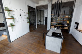 Zdjęcie "luksusowy apartament typu studio z bezpłatnym układem w stylu poddasza w ciemnych kolorach. Stylowa nowoczesna kuchnia z wyspą, przytulna sypialnia z kominkiem i siłownią" może być wykorzystywane do celów osobistych i komercyjnych zgodnie z warunkami zakupionej licencji Royalty-free. Obraz jest dostępny do pobrania w jakości wysokiej rozdzielczości do 5760x3840.