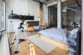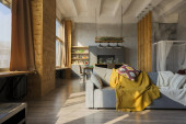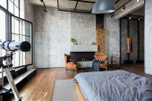 luksusowy apartament typu studio z bezpłatnym układem w stylu poddasza w ciemnych kolorach. Stylowa nowoczesna kuchnia z wyspą, przytulna sypialnia z kominkiem i siłownią