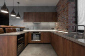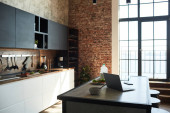 Zdjęcie "luksusowy apartament typu studio z bezpłatnym układem w stylu poddasza w ciemnych kolorach. Stylowa nowoczesna kuchnia z wyspą, przytulna sypialnia z kominkiem i siłownią" może być wykorzystywane do celów osobistych i komercyjnych zgodnie z warunkami zakupionej licencji Royalty-free. Obraz jest dostępny do pobrania w jakości wysokiej rozdzielczości do 5760x3840.