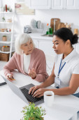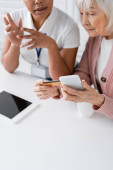 wesoły wielorasowy pracownik socjalny trzyma kubek w pobliżu seniora kobieta z karty kredytowej i gadżety