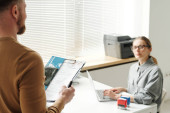 Zdjęcie "Profesjonalny urzędnik konsularny siedzący przed osobą ubiegającą się o wizę wydającą zgodę na pobyt, umieszczający pieczęć na dokumencie" może być wykorzystywane do celów osobistych i komercyjnych zgodnie z warunkami zakupionej licencji Royalty-free. Obraz jest dostępny do pobrania w jakości wysokiej rozdzielczości do 5760x3840.